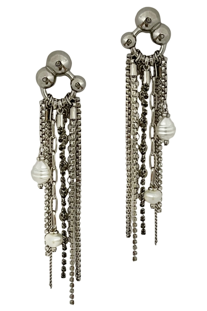 Brinco com base de esferas, mix de correntes, fio de cristais, pérolas irregulares naturais e sintéticas, no banho prata.