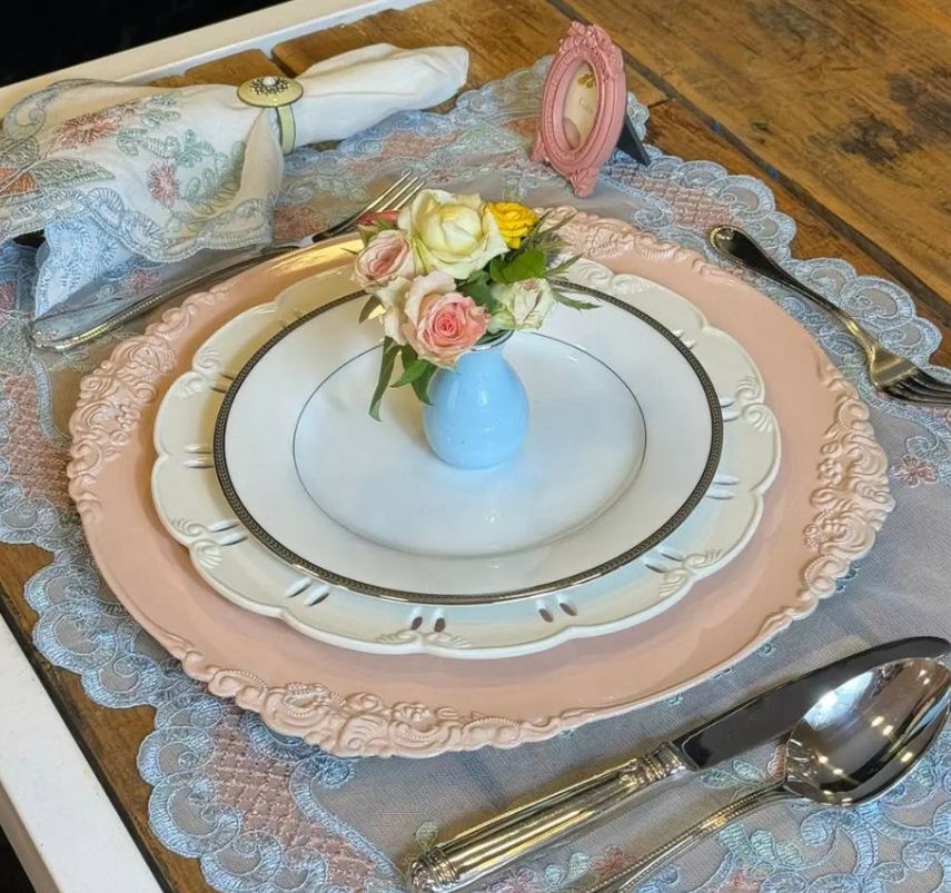 O Sousplat Rose Royale é um tributo à feminilidade clássica e ao encanto das mesas que acolhem com doçura. Seu tom rosa suave e acabamento aveludado evocam a leveza das flores francesas, enquanto as bordas em relevo, inspiradas nos ornamentos do estilo rococó, revelam um toque nobre e atemporal.